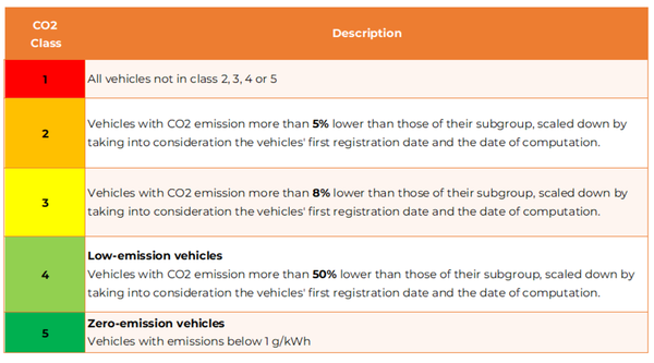 In the new charging scale, vehicles will be classified according to the C02 emission rating, which is divided into 1 to 5 levels (level 1 is the worst and level 5 is the best). Unless the vehicle is zero-emission or a new model that meets Euro VI emissions, vehicles registered before 1 July 2019 will automatically be classified as C02 emission Class 1.